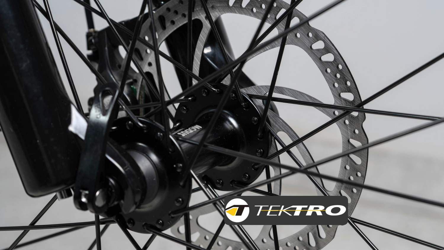 Pinza freno meccanico Tektro Aries con disco da 180-24mm e pastiglie in metallo-ceramico garantiscono sicurezza e facile manutenzione dell’ebike.